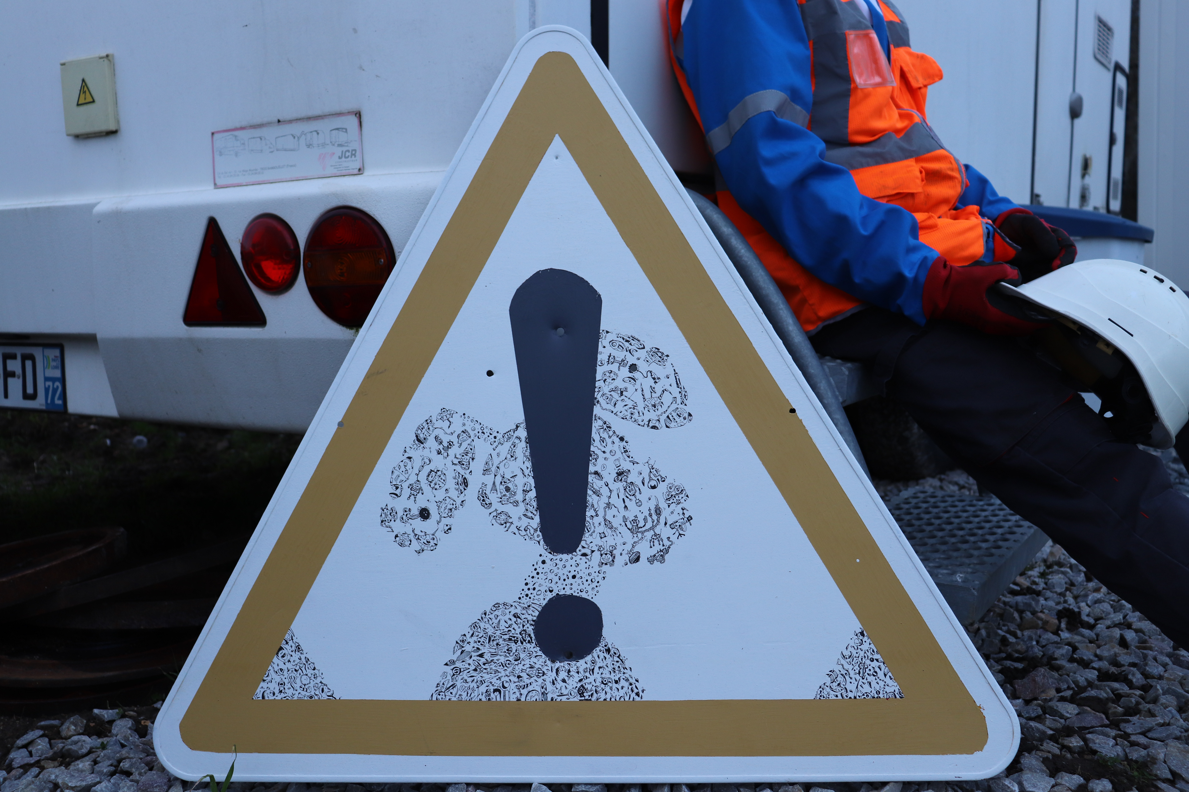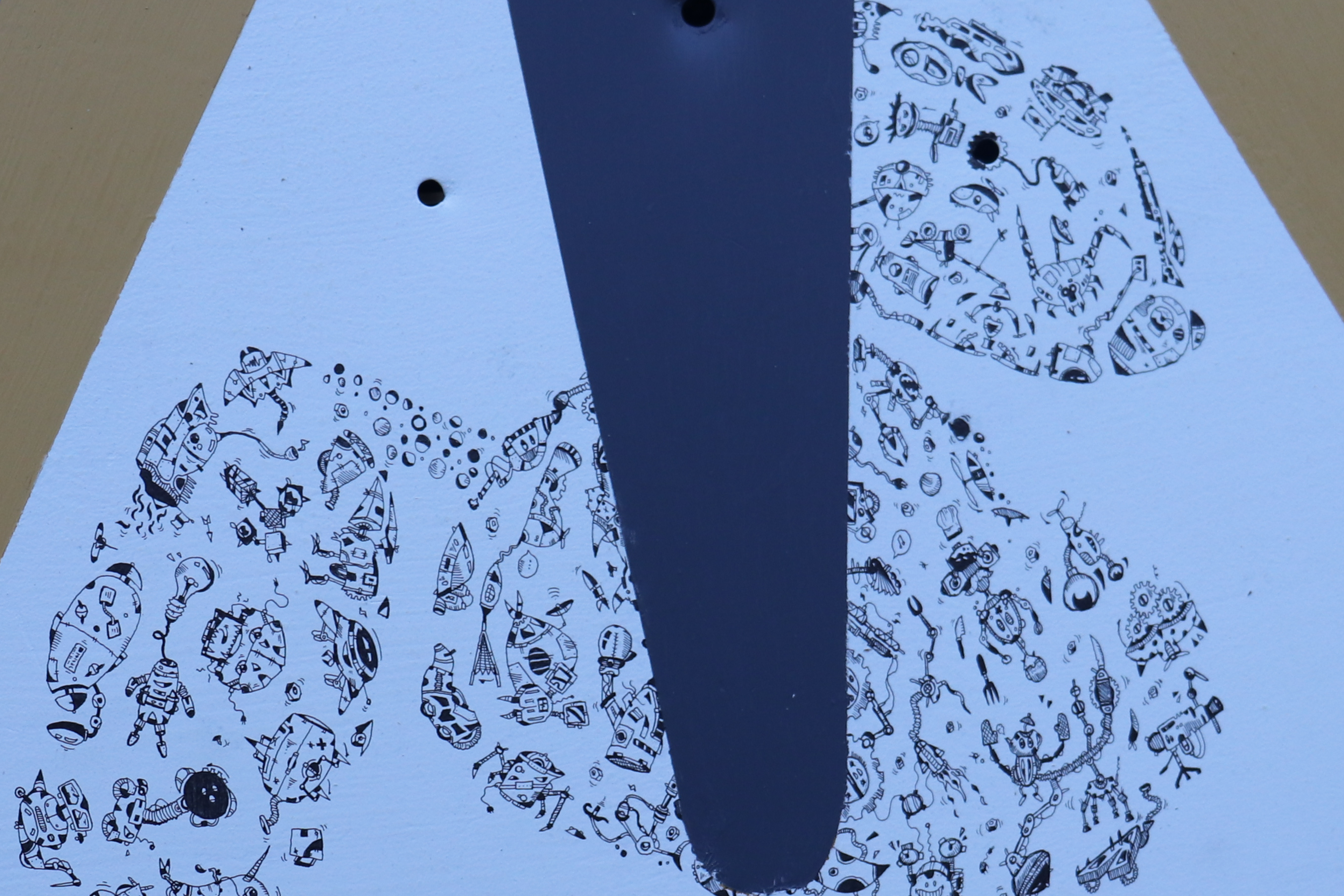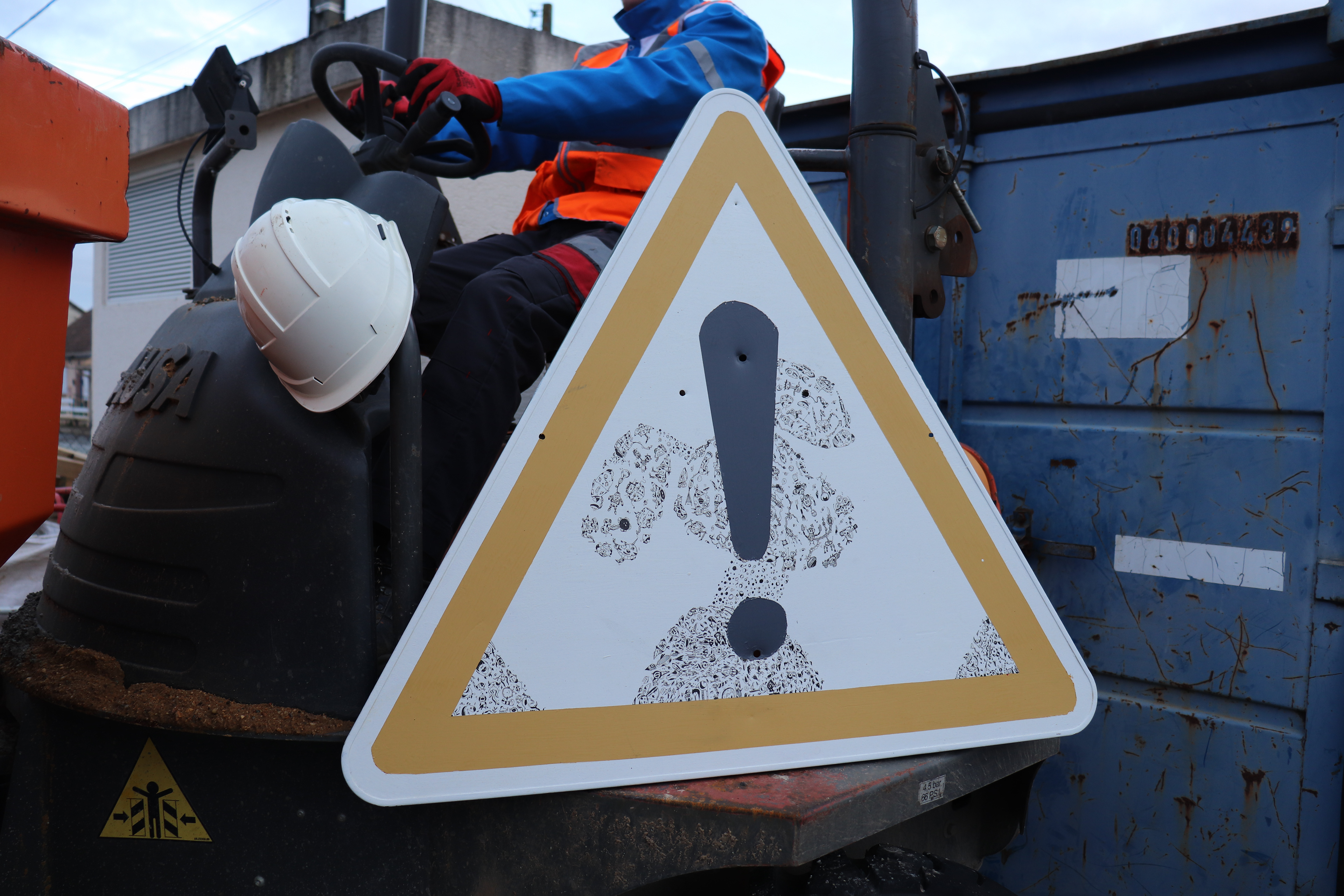 Panneau de chantier réalisé en 2022 - Panneau recyclé - Techniques : Marqueurs à encre noire et peinture