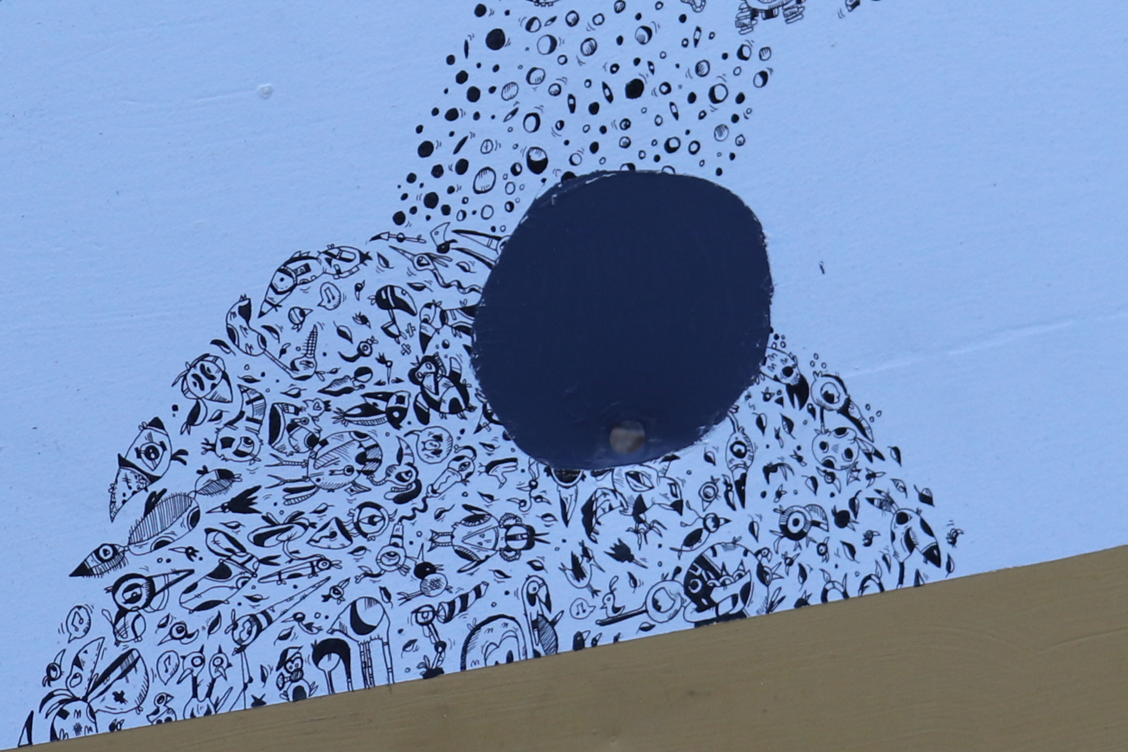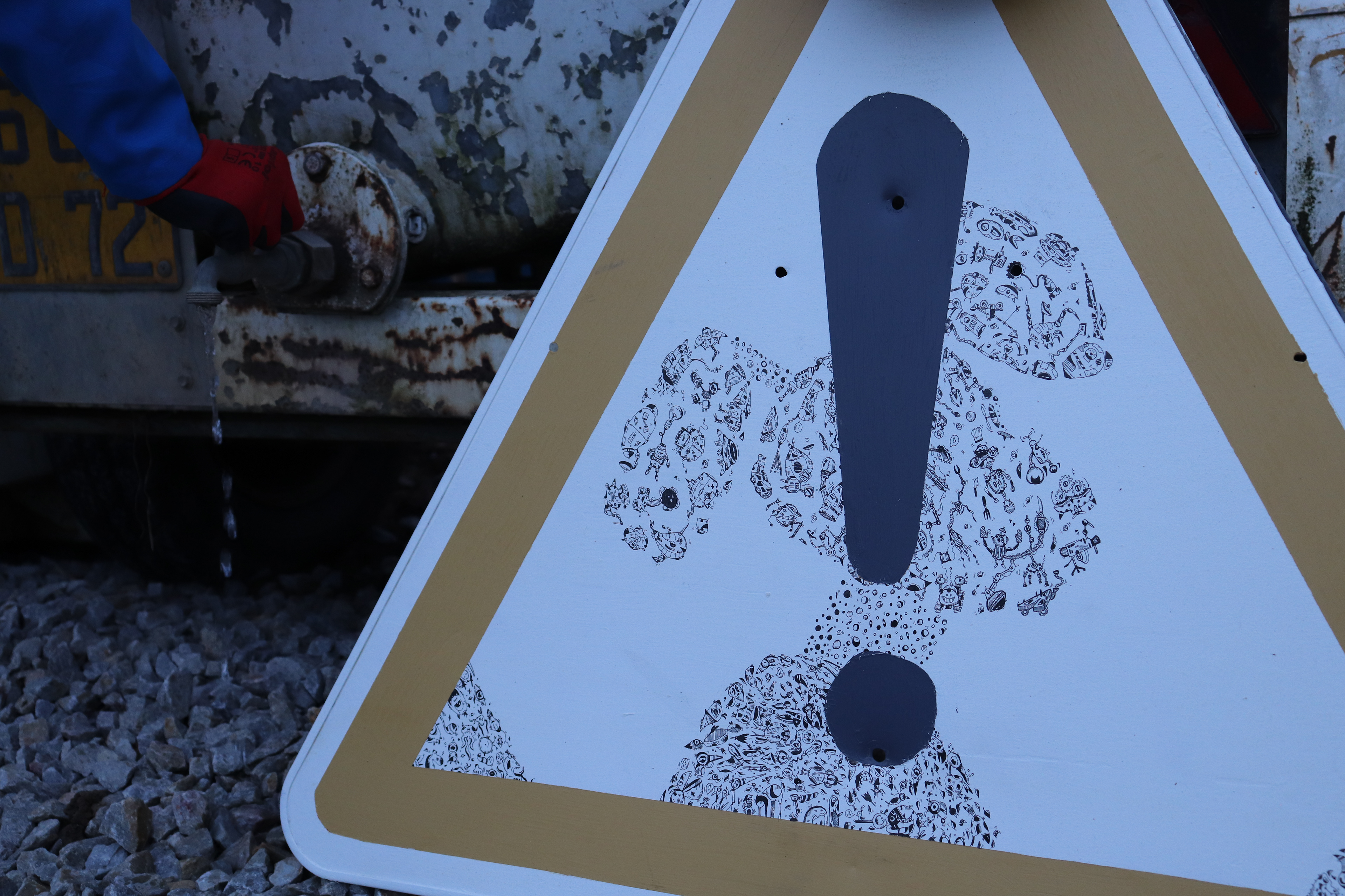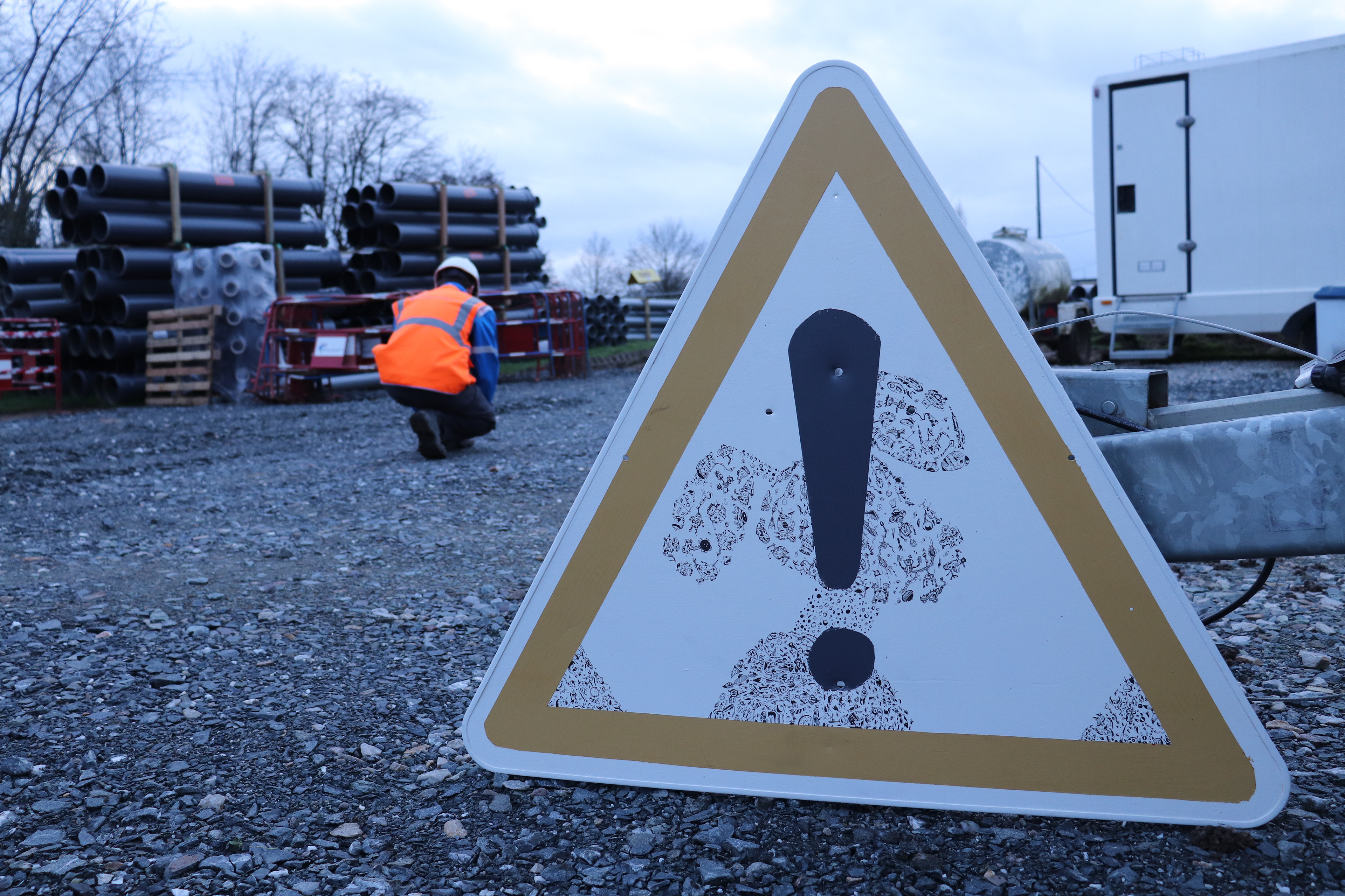 Panneau de chantier réalisé en 2022 - Panneau recyclé - Techniques : Marqueurs à encre noire et peinture